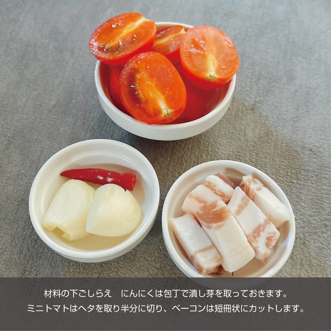 ①材料の下ごしらえ にんにくは包丁で潰し芽を取っておきます。ミニトマトはヘタを取り半分に切り、ベーコンは短冊状にカットします。