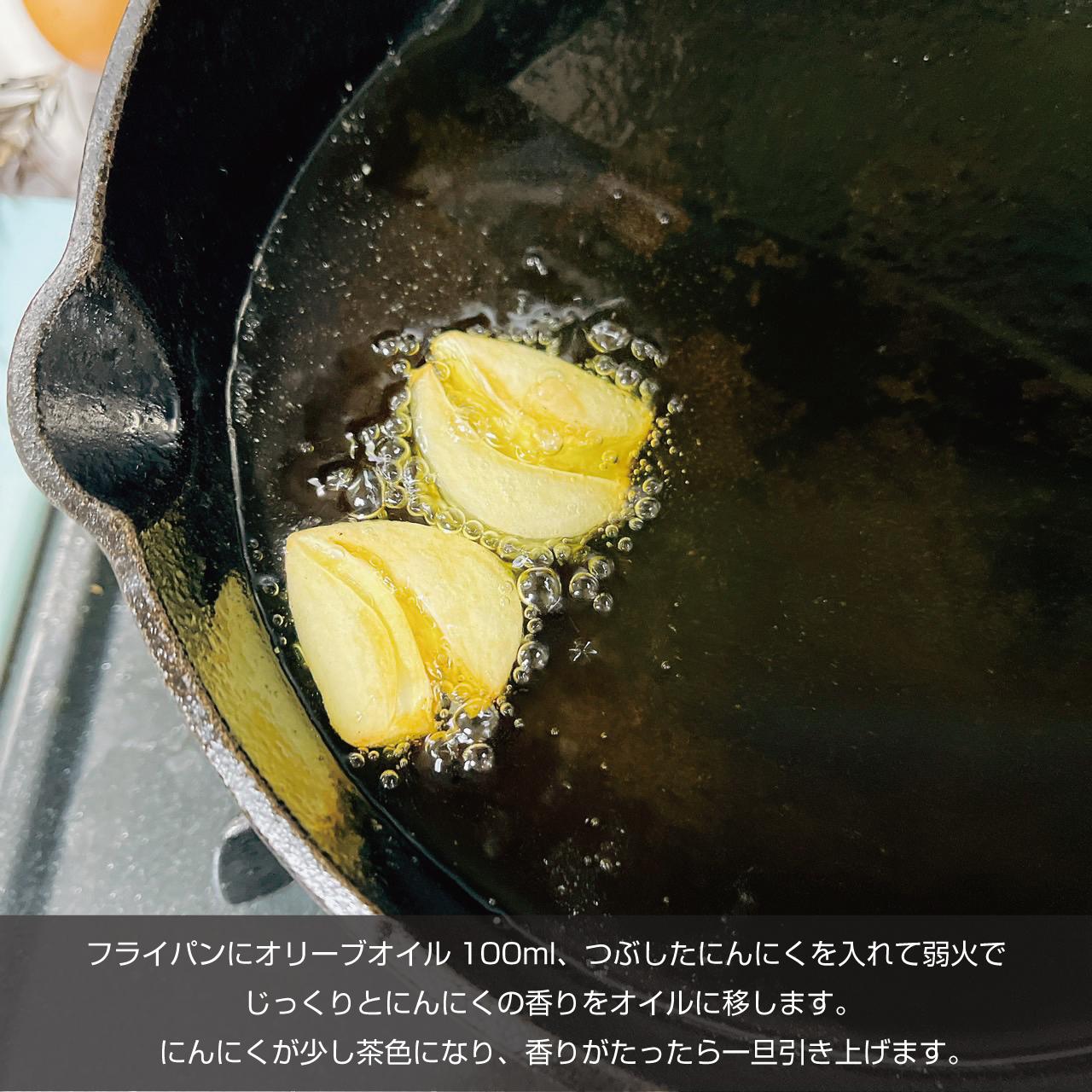 ②フライパンにオリーブオイル100ml、つぶしたにんにくを入れて弱火でじっくりとにんにくの香りをオイルに移します。弱火でじっくりとやり、にんにくが少し茶色になり、香りがたったら一旦引き上げます。