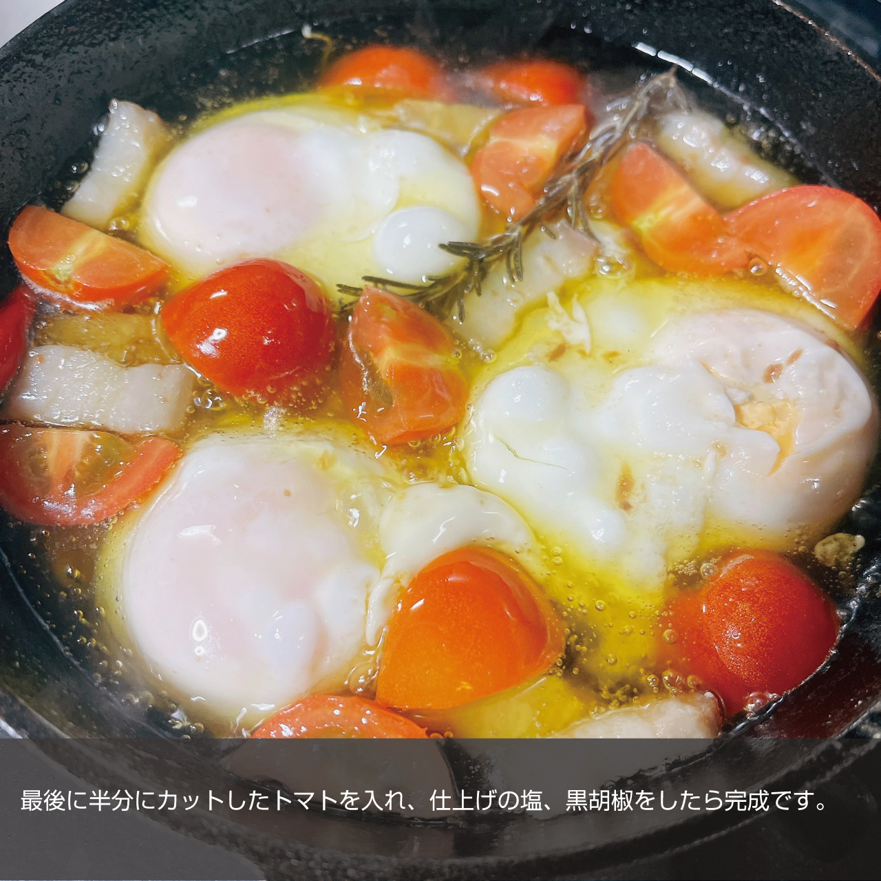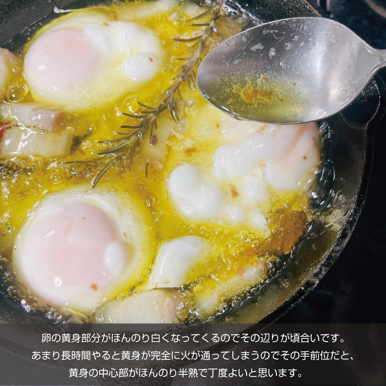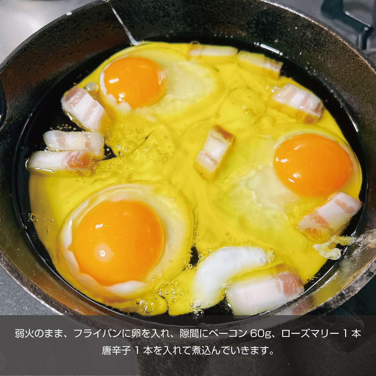 ③火は弱火のまま、フライパンに卵を入れ、隙間にベーコン60g、ローズマリー1本、唐辛子1本を入れて煮込んでいきます。