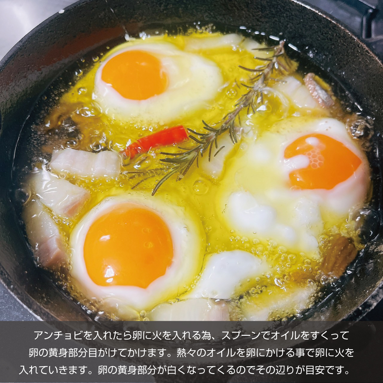 ④アンチョビを入れたら卵に火を入れる為、スプーンでオイルをすくって卵の黄身部分目がけてかけます(アロゼ)熱々のオイルを卵にかける事で卵に火を入れていきます。 何度か繰り返すと卵の黄身部分が白くなってくるのでその辺りが目安になります。