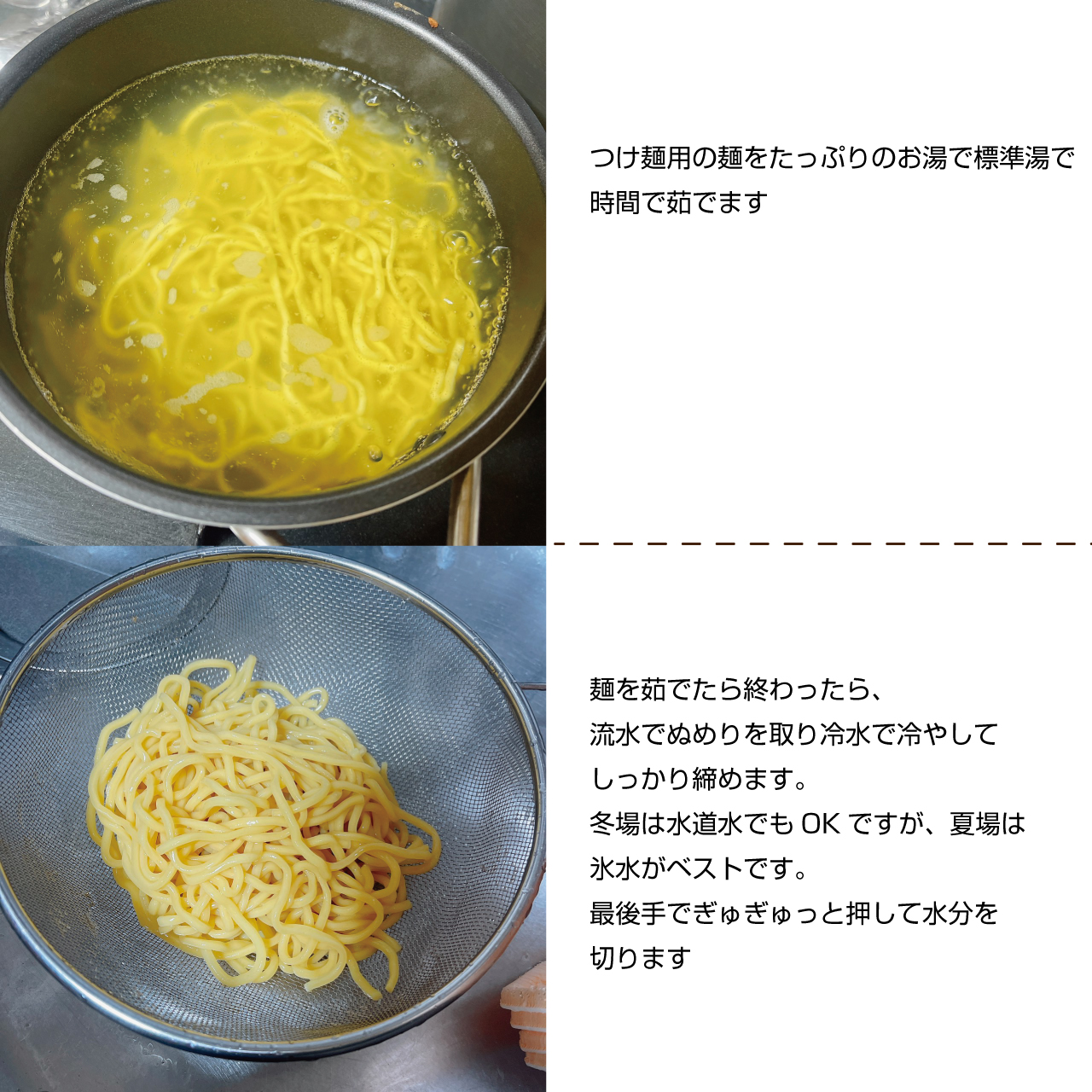 ③麺を茹でたら終わったら、流水でぬめりを取り冷水で冷やしてしっかり締めます。冬場は水道水でもOKですが、夏場は氷水がベストです。最後手でぎゅぎゅっと押して水分を切ります