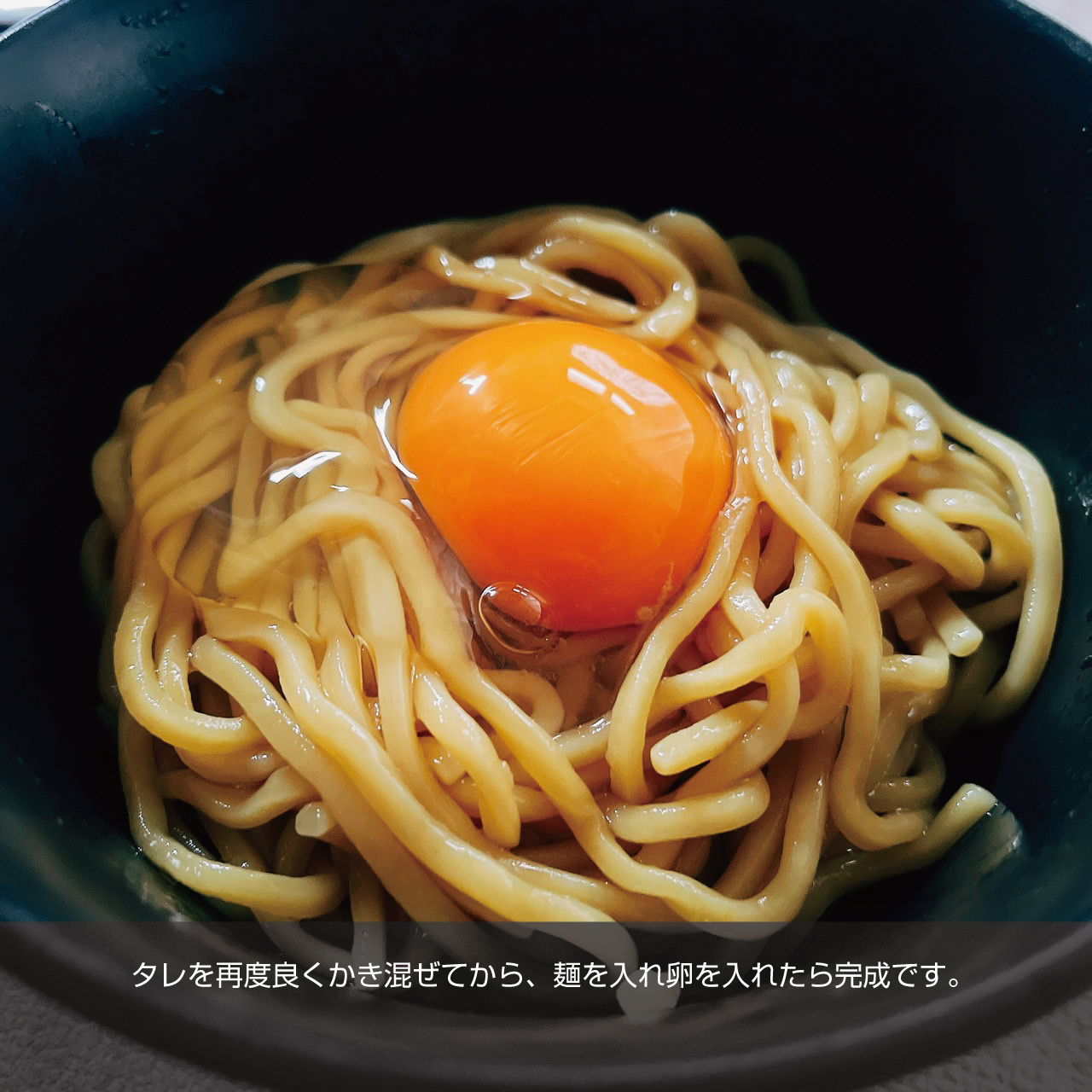 ④タレを再度良くかき混ぜてから、麺を入れ卵を入れたら完成です。