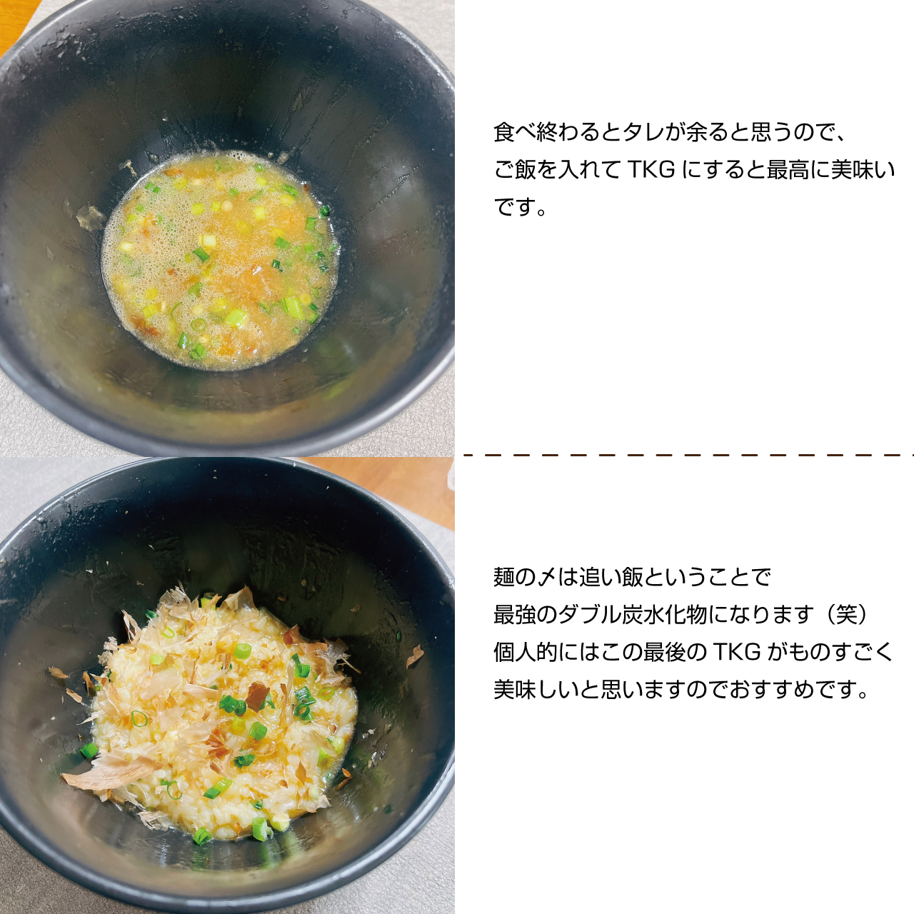 麺を食べ終えたあとに残ったタレにご飯を入れるとめちゃくちゃ美味いです。追い飯がおすすめ