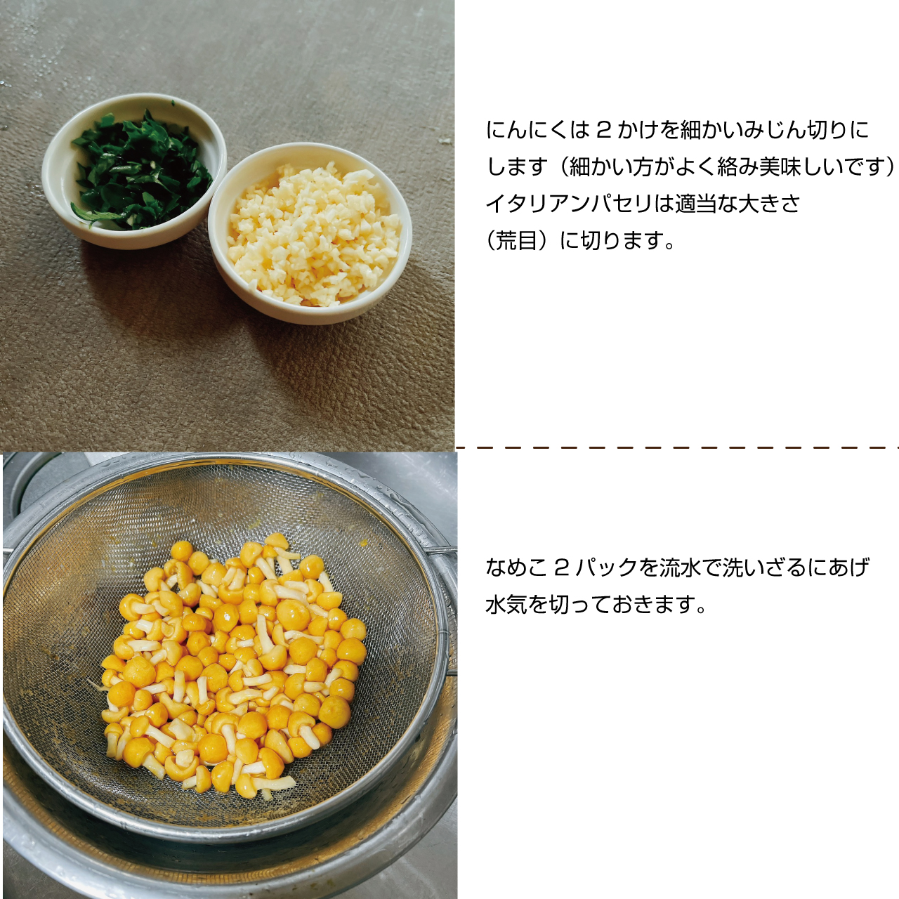 ①にんにくは2かけを細かいみじん切りにします(細かい方がよく絡み美味しいです)イタリアンパセリは適当な大きさ(荒目)に切ります。なめこ2パックを流水で洗いざるにあげ水気を切っておきます。