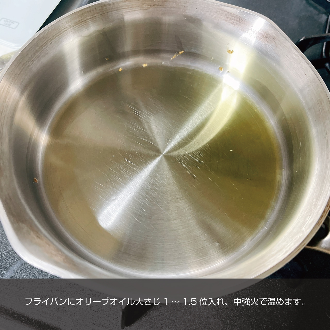 ②フライパンにオリーブオイル大さじ1~1.5位入れ、中強火で温めてから水気を切ったなめこを入れ炒めます。しばらくするとなめこから水分が出ますがさらに炒め続けます。時々混ぜてください。なめこの最初の量の1/3位が目安です。