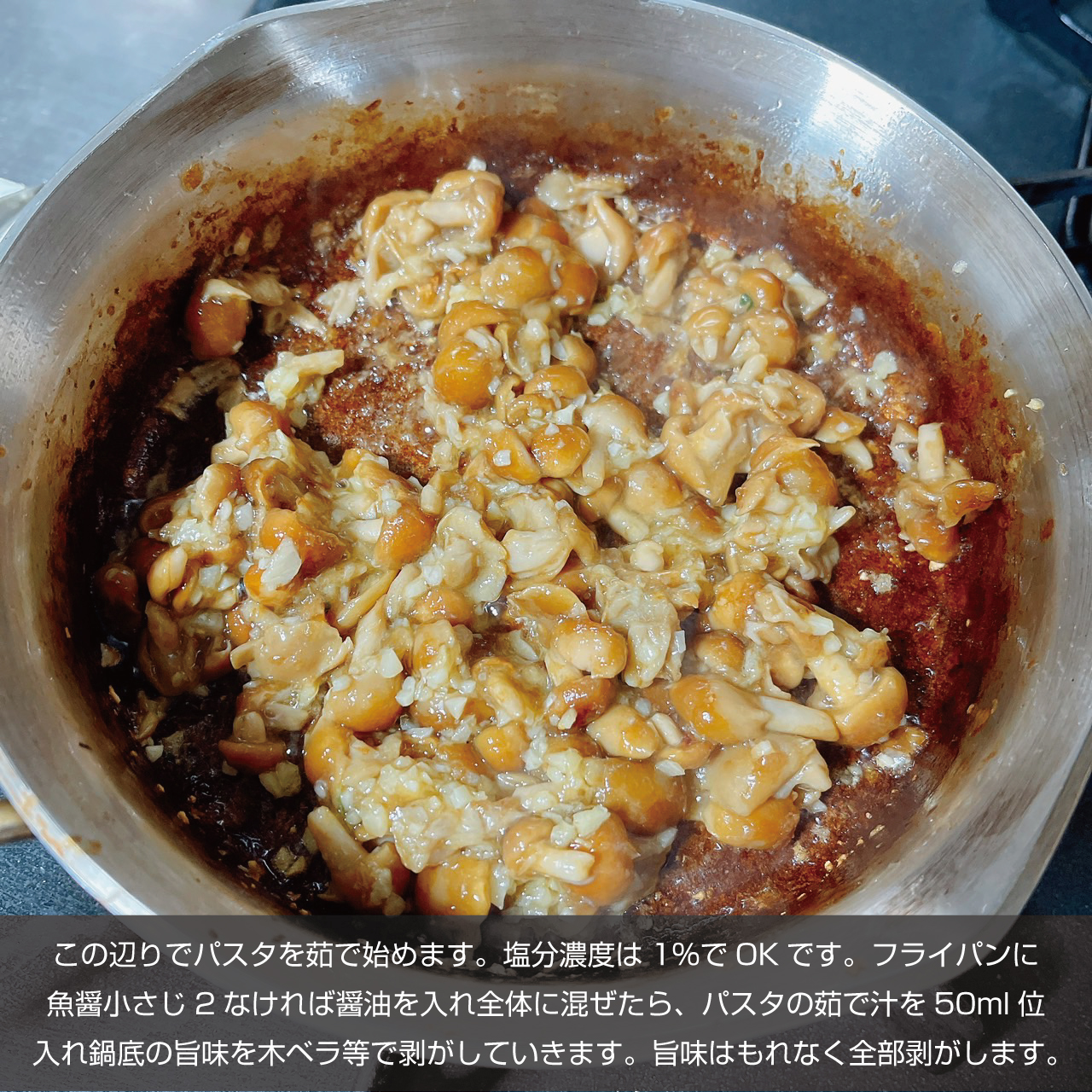 このパスタはなめこをしっかり焼け、鍋底に旨味を貼りつけ茹で汁でしっかり剥がす所がポイントです。黒焦げはダメですが、茶色の香ばしい焼色を目指してください。