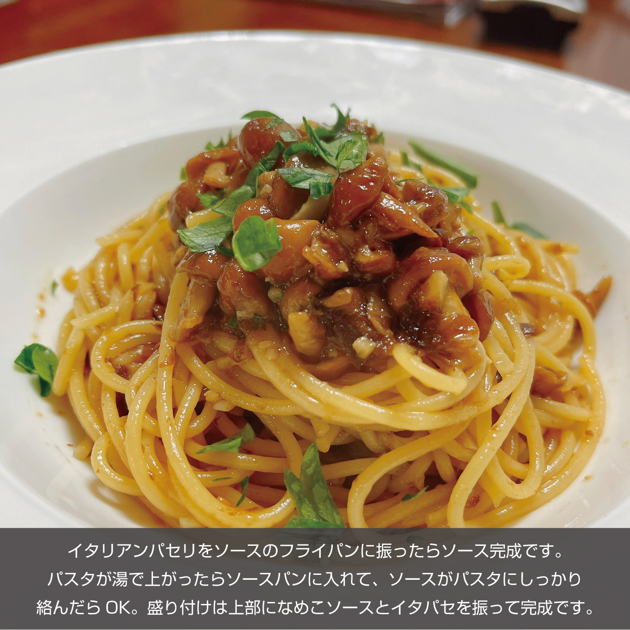 ⑧盛り付け 器にパスタを盛り付けて、なめこソースを上部にのせイタリアンパセリを最後に振ったら完成です。