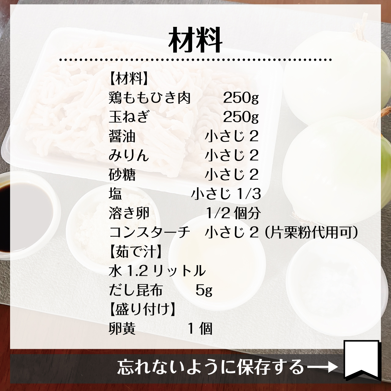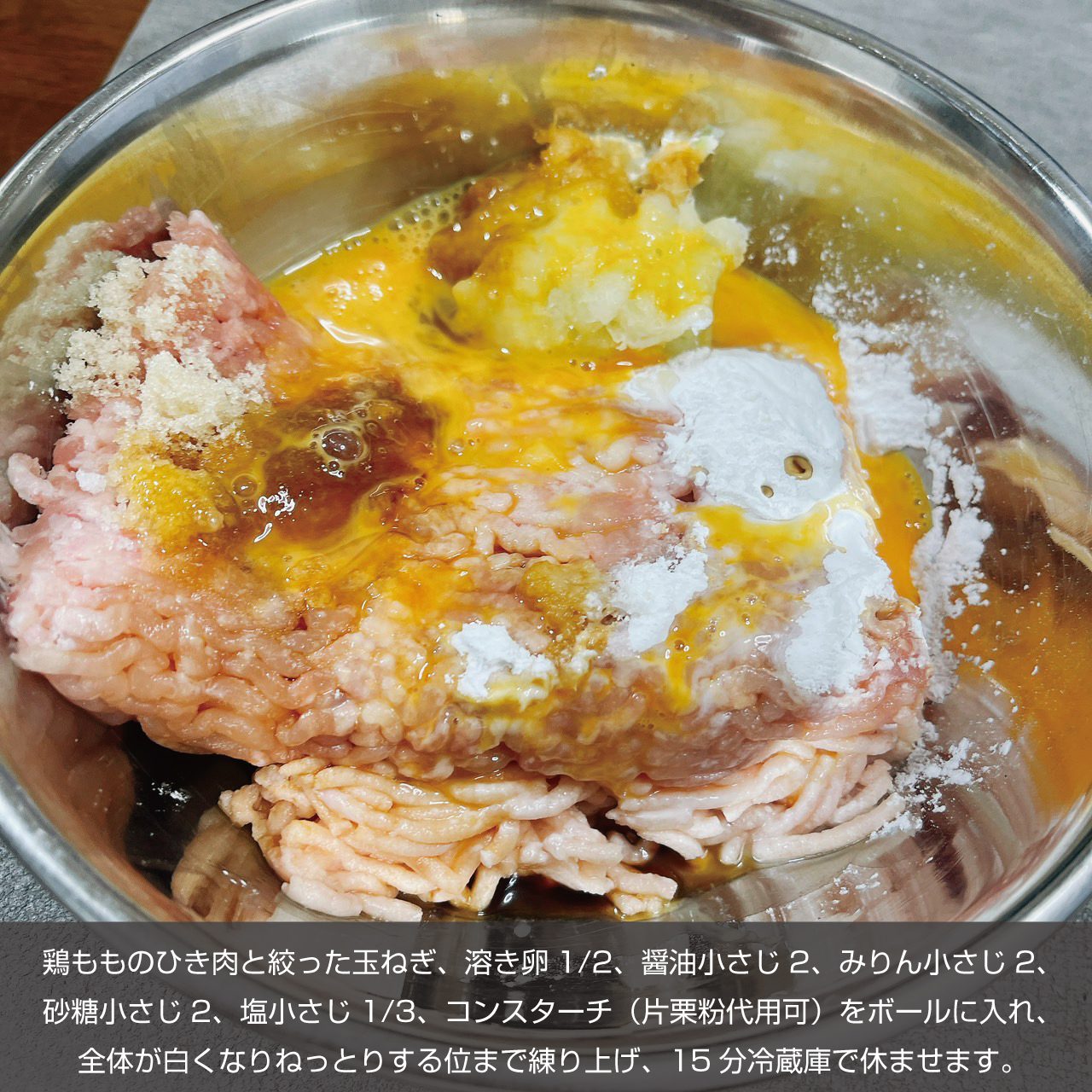 ②鶏もものひき肉と絞った玉ねぎ、溶き卵1/2、醤油小さじ2、みりん小さじ2、砂糖小さじ2、塩小さじ1/3、コンスターチ(片栗粉代用可)をボールに入れ、しっかり混ぜて練り上げてください。全体が白くなりねっとりする位までしっかりと練るのがポイントです。15分冷蔵庫で休ませて調味料をひき肉になじませます。