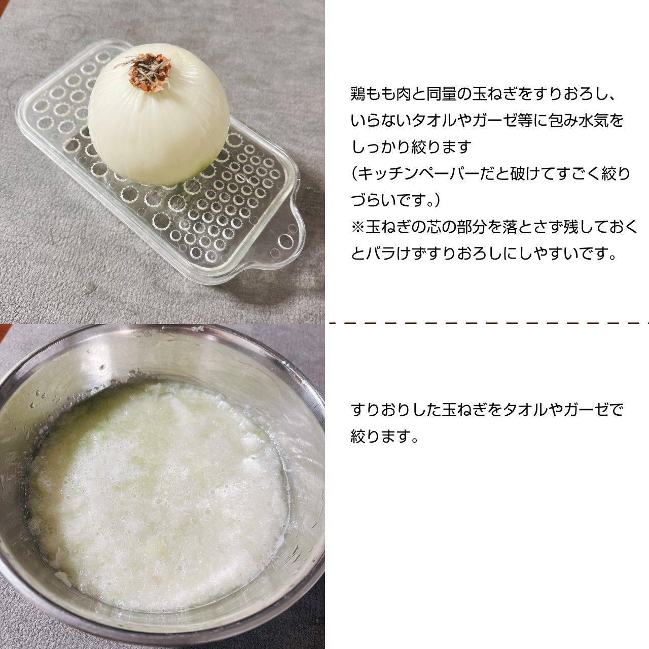 ①鶏もも肉と同量の玉ねぎをすりおろし、いらないタオルやガーゼ等に包み水気をしっかり絞ります(キッチンペーパーだと破けてすごく絞りづらいです。)