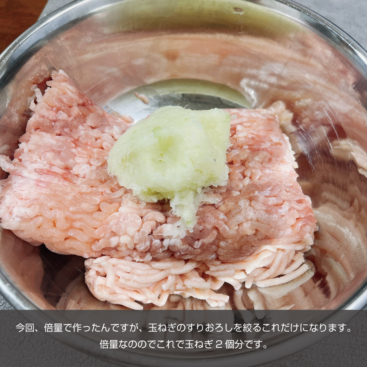 玉ねぎの液体は使わないのでちょっともったいない気がしますが、すりおろしの液体にはたまねぎの辛味やエグミが含まれるのでしっかり絞ってから具材に混ぜます。