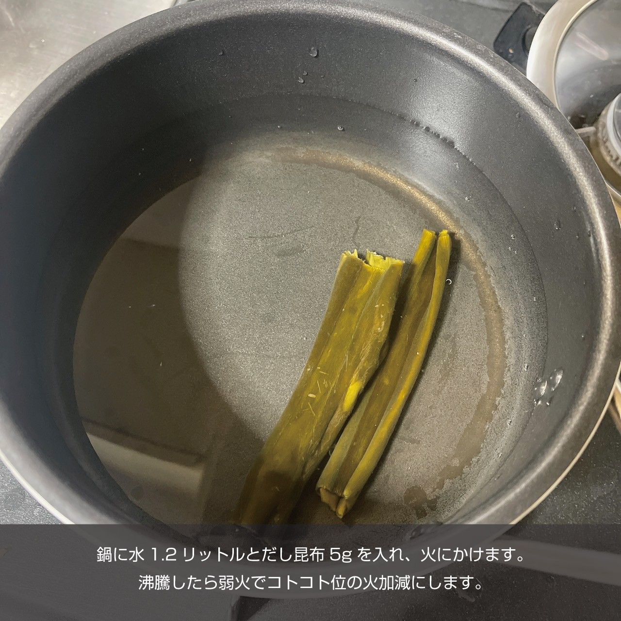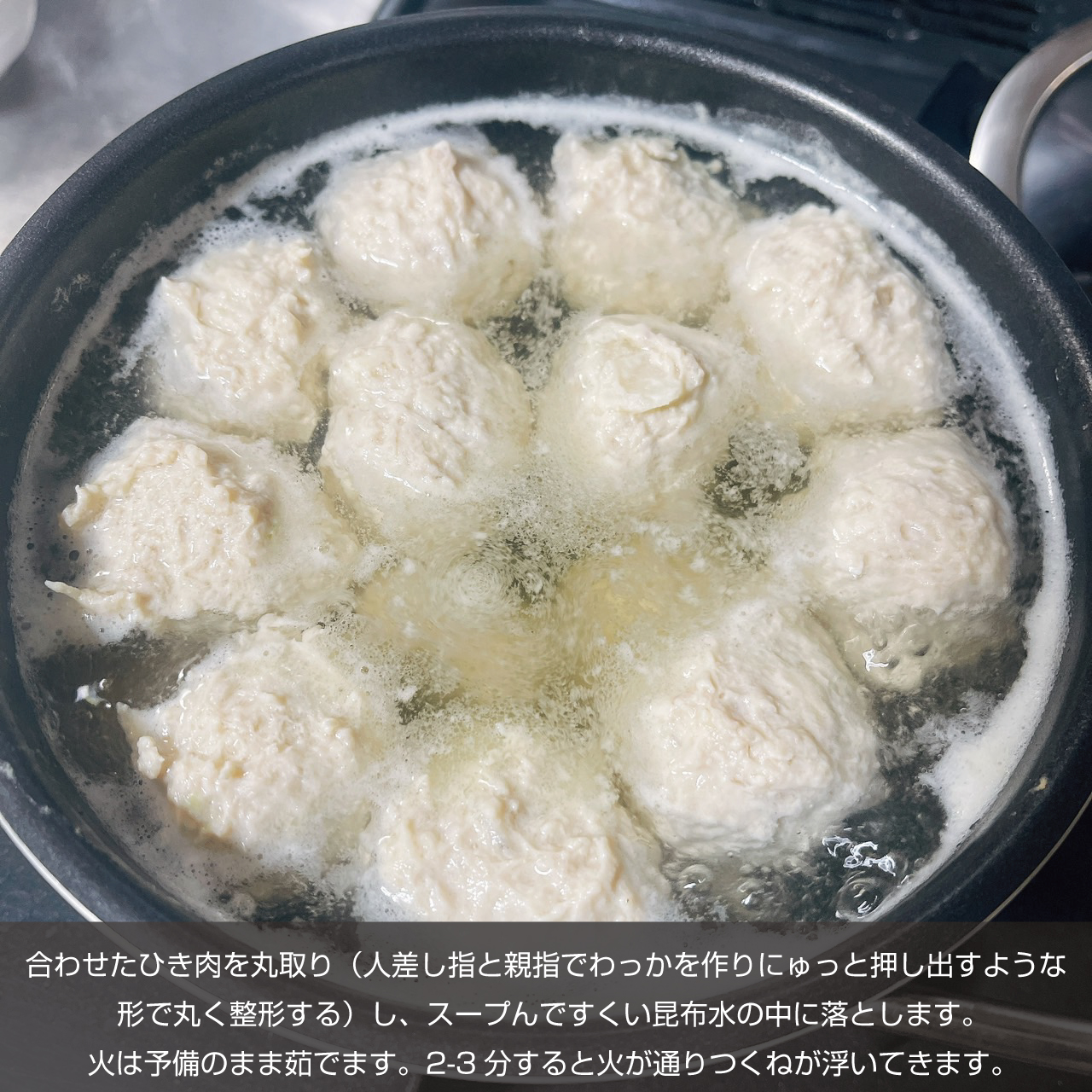③鍋に水1.2リットルとだし昆布5gを入れ、火にかけます。沸騰したら弱火でコトコト位の火加減にします。合わせてたひき肉を丸取り(ひき肉を手に取り、人差し指と親指でわっかを作りにゅっと押し出すような形で丸く整形する)し、スプーンですくって昆布水の中に落とします。火は予備のまま茹でます。2-3分すると火が通りつくねが浮いてきます。これが火が通った目安になります。
