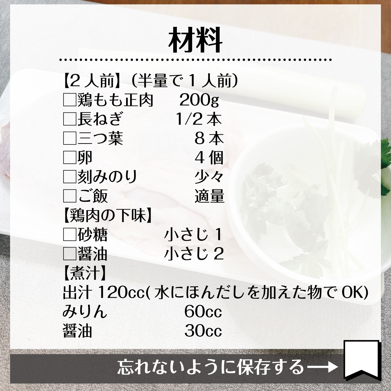 ※今回用意する量は2人前になりますが、⑥の工程から1人前(仕込んだ半量)を使うのでご注意ください。