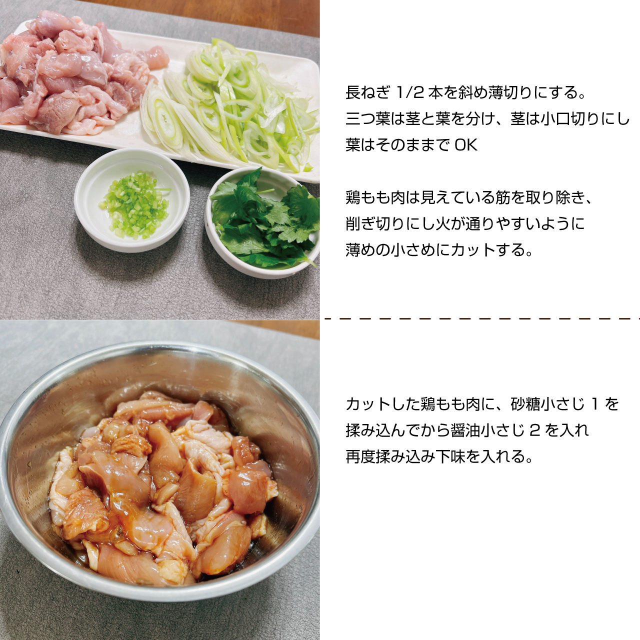 ②鶏もも肉は見えている筋を取り除き、削ぎ切りにし火が通りやすいように薄めの小さめにカットする。
