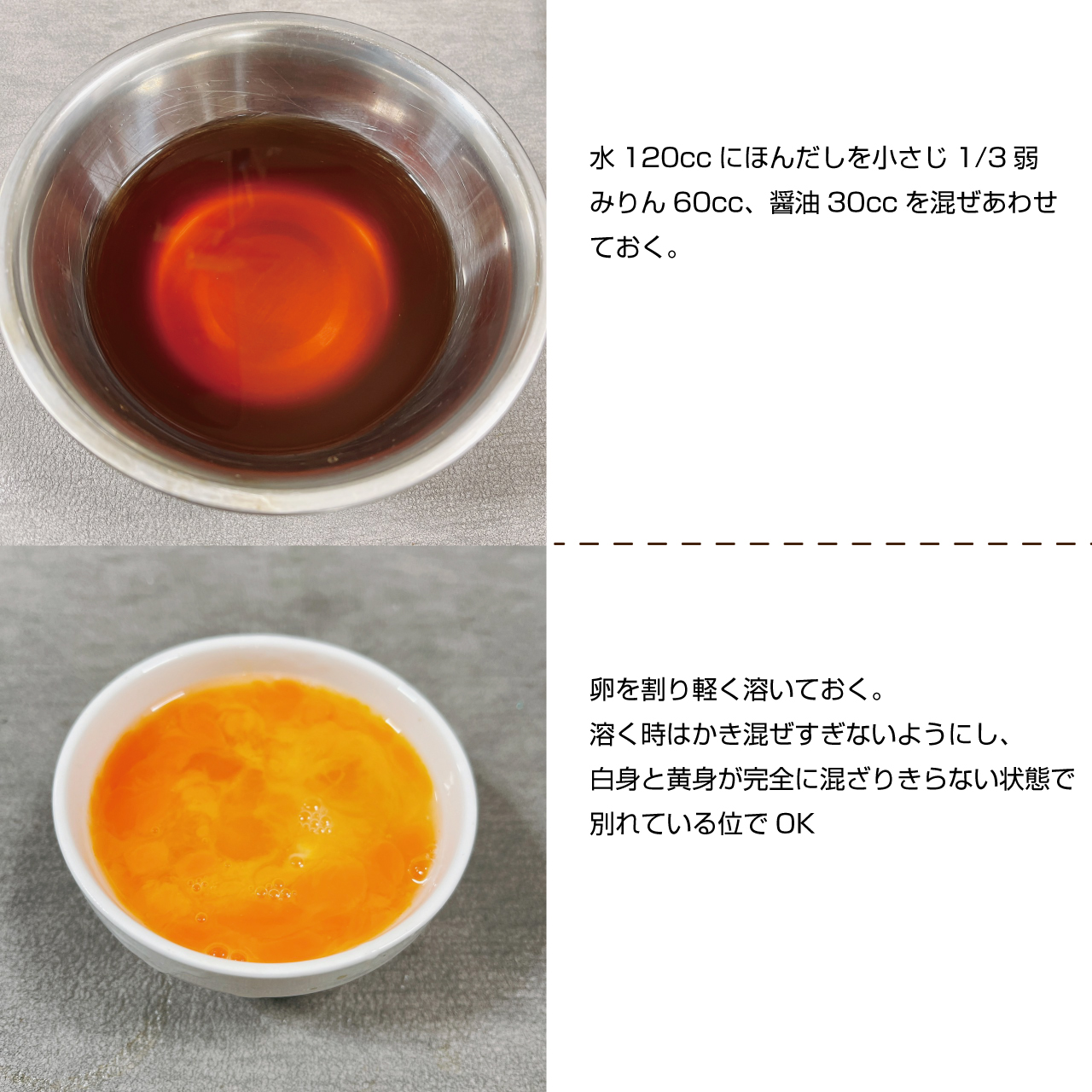 ④水120ccにほんだしを小さじ1/3弱、みりん60cc、醤油30ccを混ぜあわせておく。