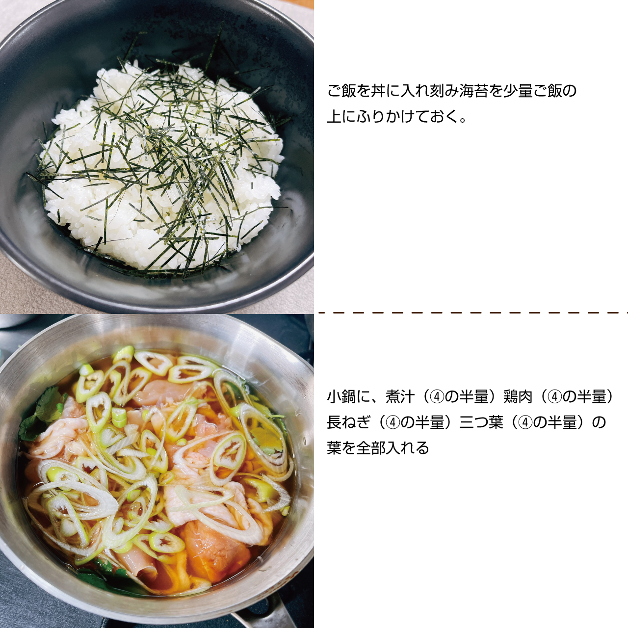 ⑥小鍋に、煮汁(④の半量)鶏肉(④の半量)長ねぎ(④の半量)三つ葉(④の半量)の葉を全部入れ、ご飯を丼に入れ刻み海苔を少量ご飯の上にふりかけておく。