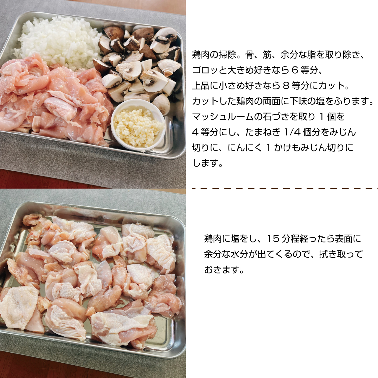 ①鶏肉の掃除。骨、筋、余分な脂を取り除き、ゴロッと大きめ好きなら6等分、上品に小さめ好きなら8等分にカットします。カットした鶏肉の両面に下味の塩をふります。