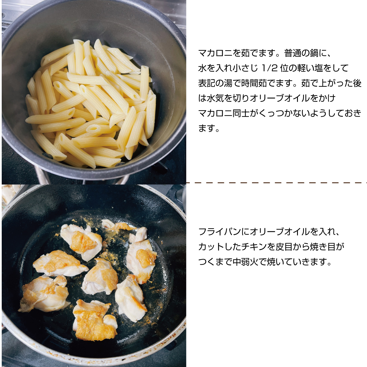 ③マカロニを茹でます。普通の鍋に、水を入れ小さじ1/2位の軽い塩をして表記の湯で時間茹でます。茹で上がった後は水気を切りオリーブオイルをかけマカロニがくっつかないようにしておくとよいです。