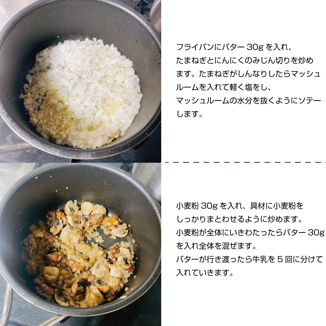 ⑤フライパンにバター30gを入れ、たまねぎとにんにくのみじん切りを炒めます。たまねぎがしんなりしたらマッシュルームを入れて軽く塩をし、マッシュルームの水分を抜くようにソテーします。