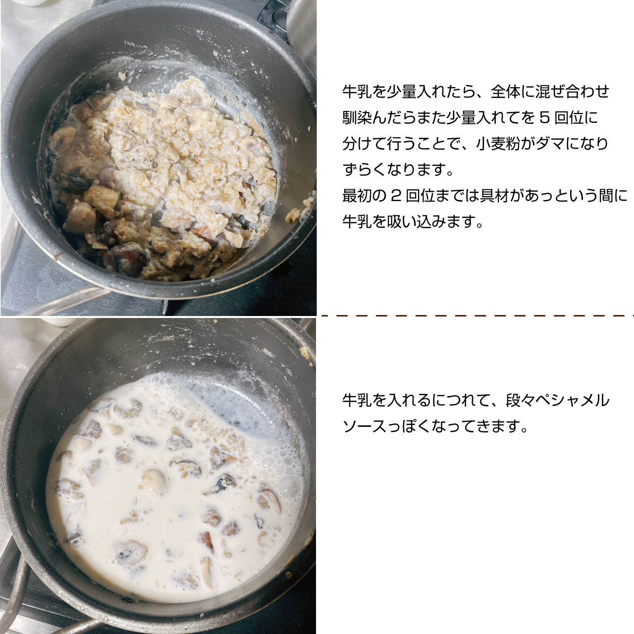 小麦粉がダマにならないように少しづつ分けて入れる事で具材と牛乳を一体化させます。