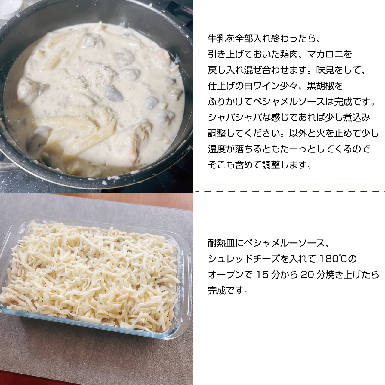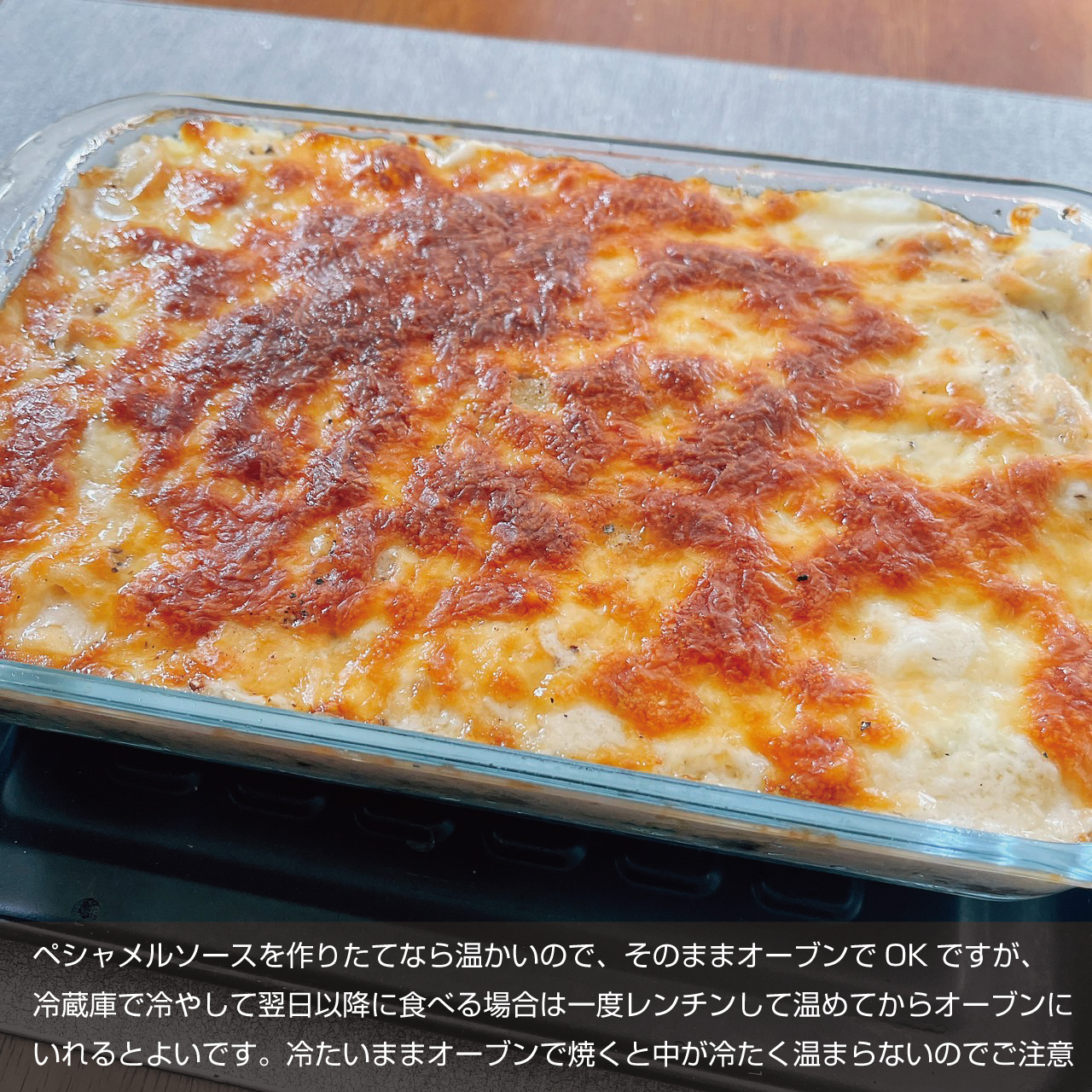 ⑨耐熱皿にペシャメルーソース、シュレッドチーズを入れて180℃のオーブンで15分から20分焼き上げたら完成です。