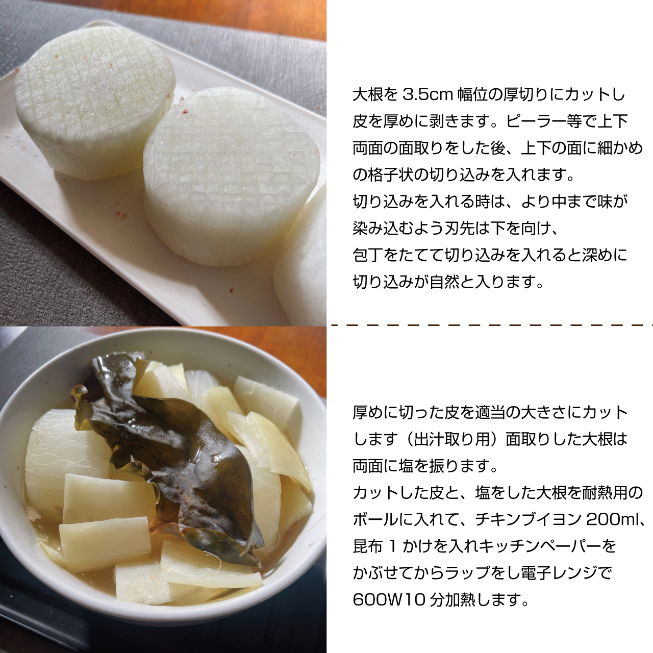 ③カットした皮と、塩をした大根を耐熱用のボールに入れて、チキンブイヨン200ml、昆布1かけを入れキッチンペーパーをかぶせてからラップをし電子レンジで600W10分加熱します。