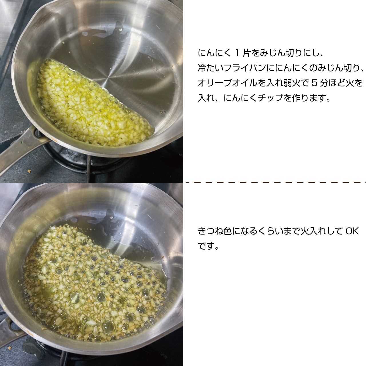 ⑤にんにく1片をみじん切りにし、冷たいフライパンににんにくのみじん切り、オリーブオイルを入れ弱火で5分ほど火を入れ、にんにくチップを作ります。