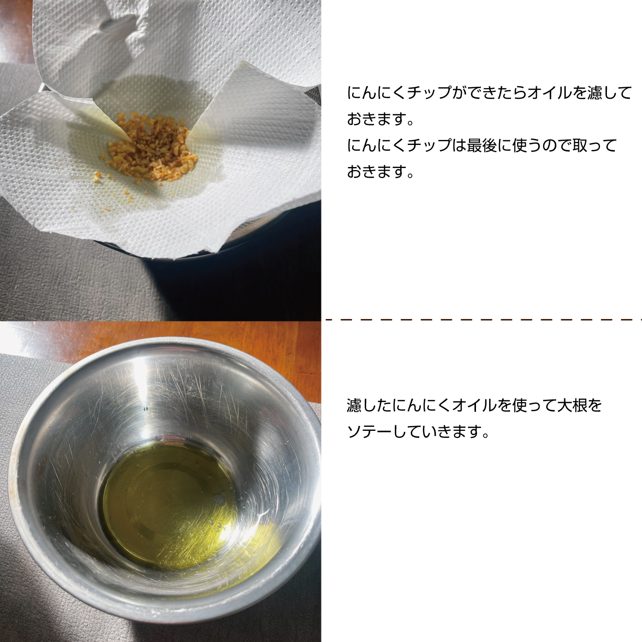 にんにくチップができたらオイルを濾しておきます。にんにくチップは最後に使うので取っておきます。