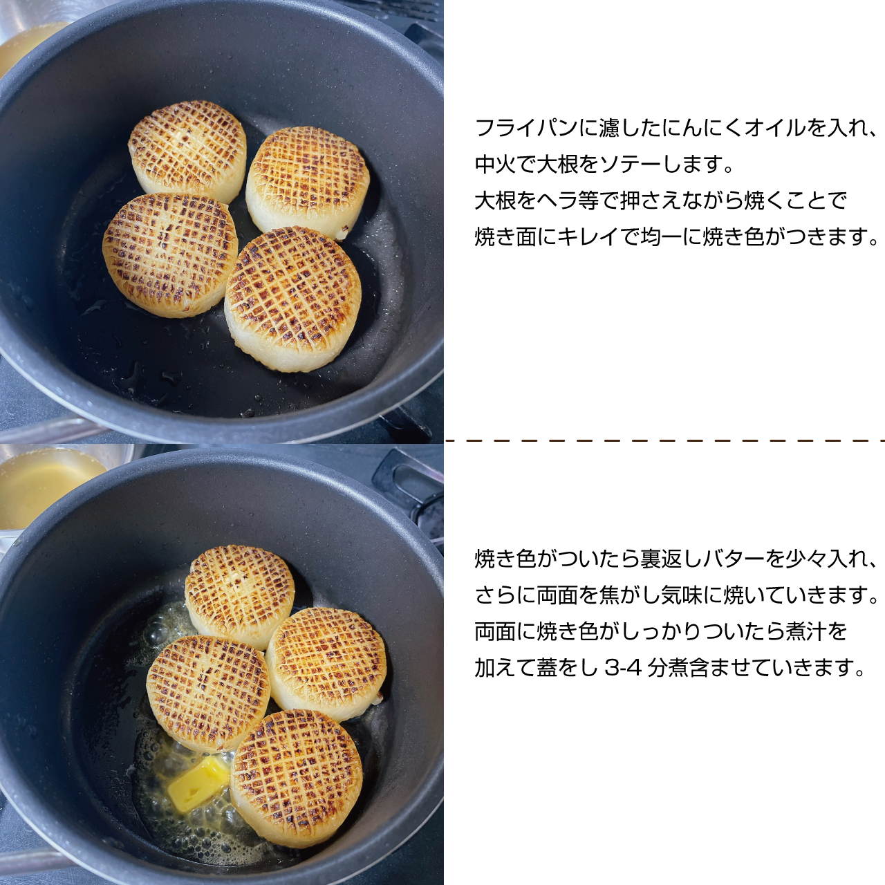 ⑥フライパンに濾したにんにくオイルを入れ、中火で大根をソテーします。大根をヘラ等で押さえながら焼くことで焼いた面にキレイで均一に焼き色がつきます。