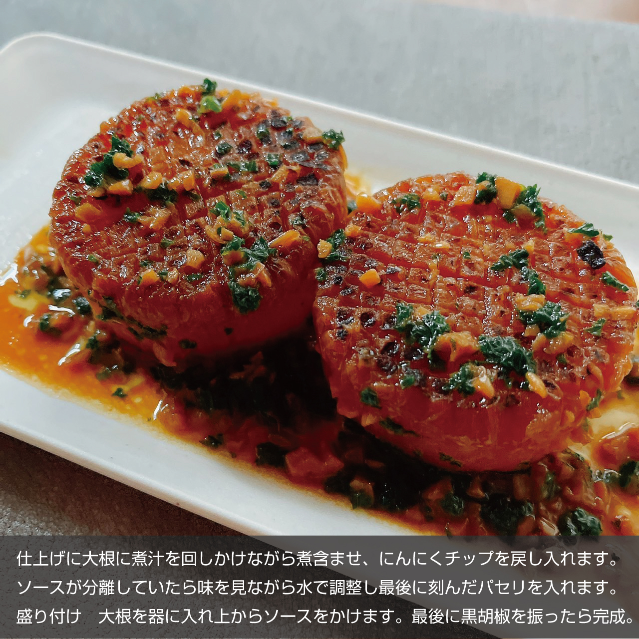 ⑧仕上げに大根に煮汁を回しかけながら煮含ませ、にんにくチップを戻し入れます。ソースが分離していたら味を見ながら水で調整し最後に刻んだパセリを入れます。