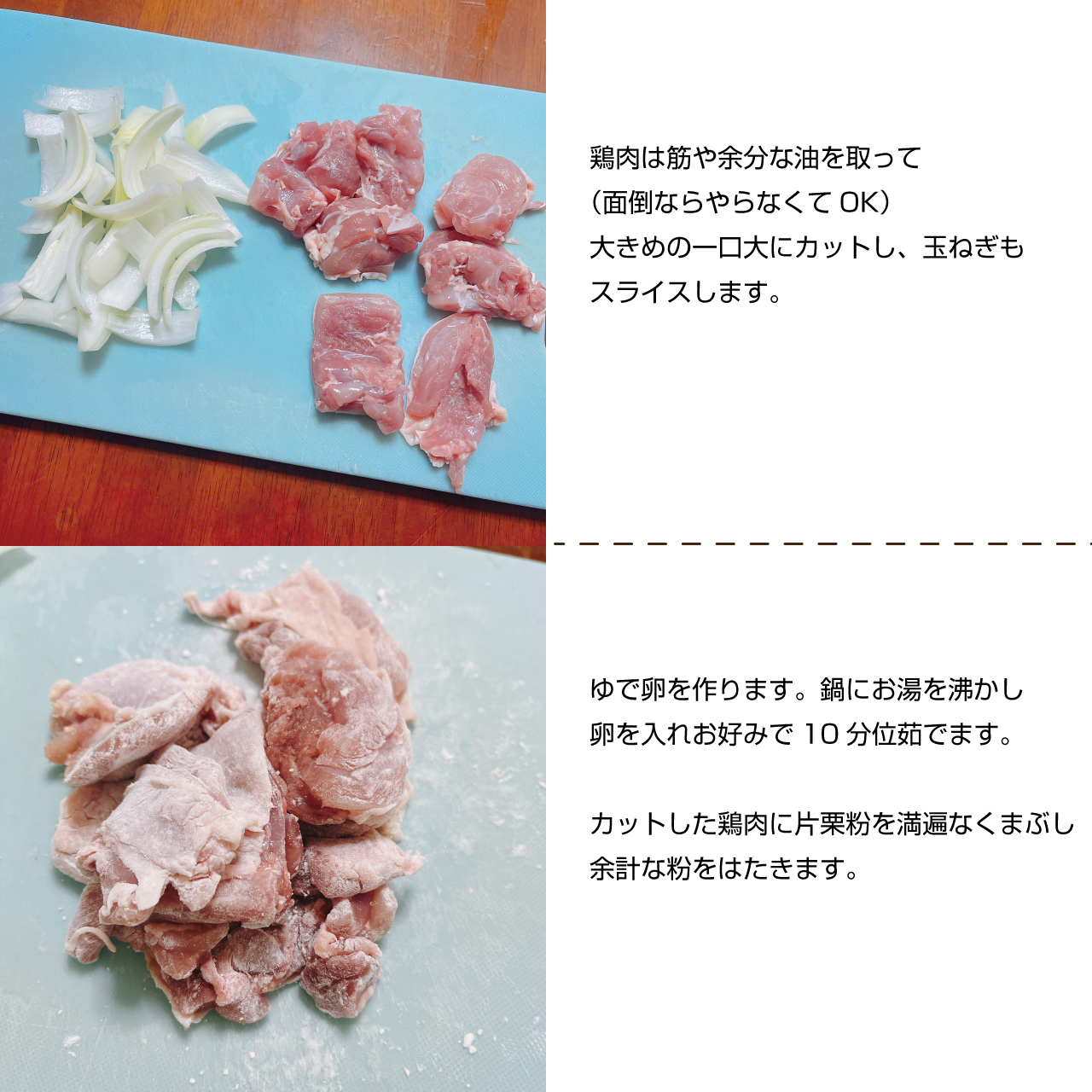 ①鶏肉は筋や余分な油を取って(面倒ならやらなくてOK)大きめの一口大にカットし、玉ねぎもスライスします。