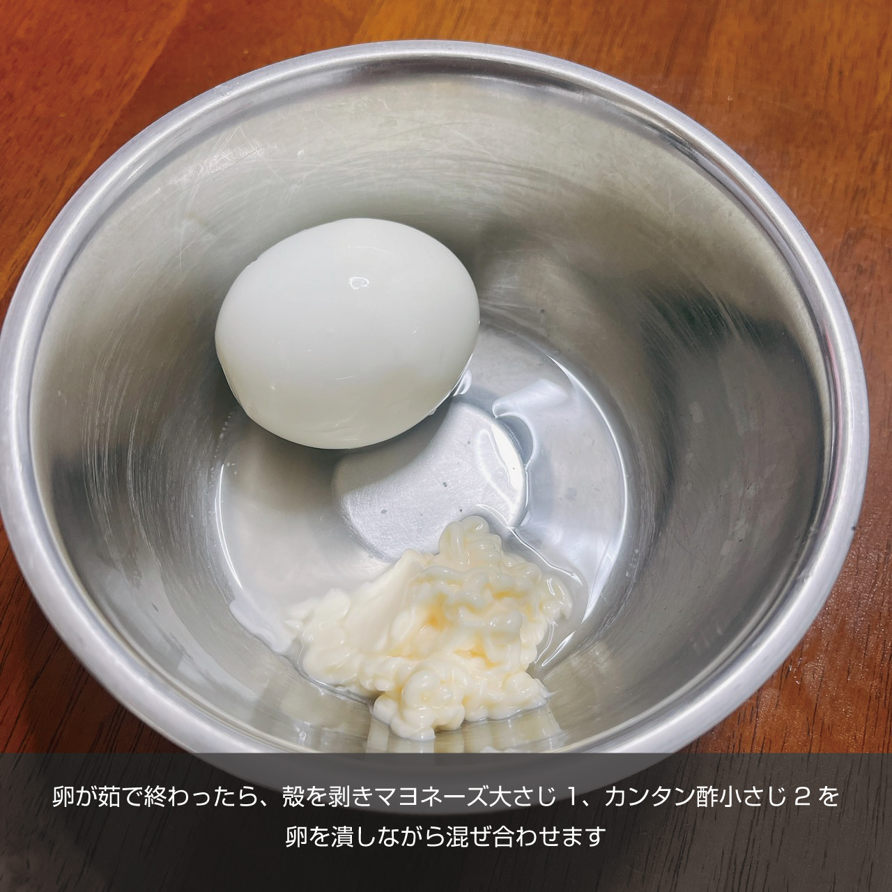 ②ゆで卵を作ります。鍋にお湯を沸かし卵を入れお好みで10分位茹でます。茹でたら殻を剥いて、マヨネーズ大さじ1、カンタン酢小さじ2を卵を潰しながら混ぜ合わせます。
