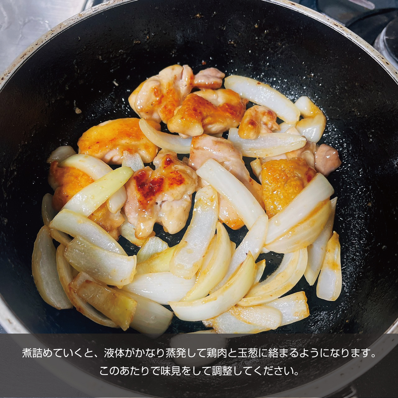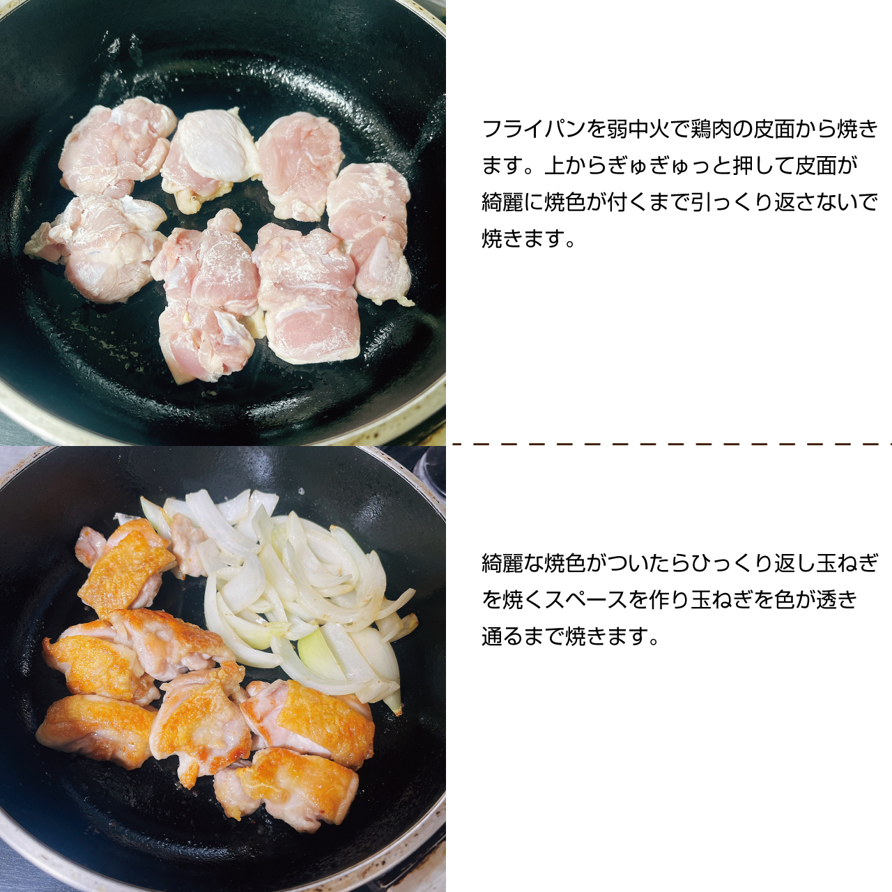 ③カットした鶏肉に片栗粉を満遍なくまぶし余計な粉をはたきます。フライパンを弱中火で鶏肉の皮面から焼きます。上からぎゅぎゅっと押して皮面が綺麗に焼色が付くまで引っくり返さないで焼きます。綺麗な焼色がついたらひっくり返し玉ねぎを焼くスペースを作り玉ねぎを色が透き通るまで焼きます。