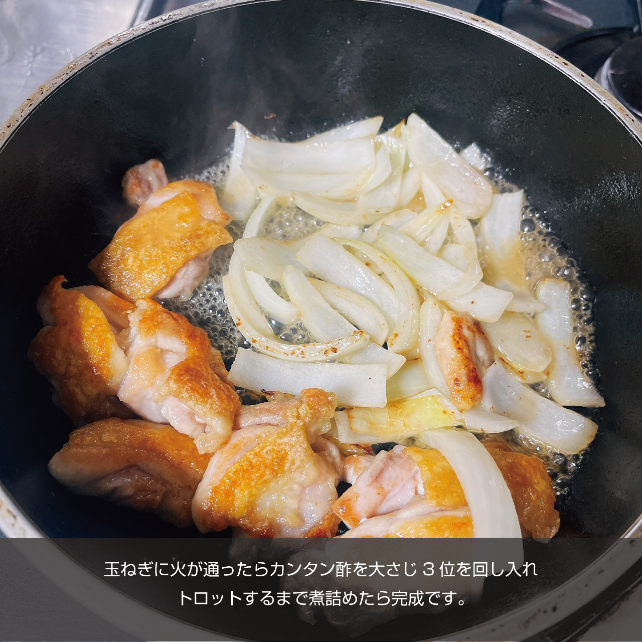 ④玉ねぎに火が通ったらカンタン酢を大さじ3位を回し入れトロットするまで煮詰めたら完成です。