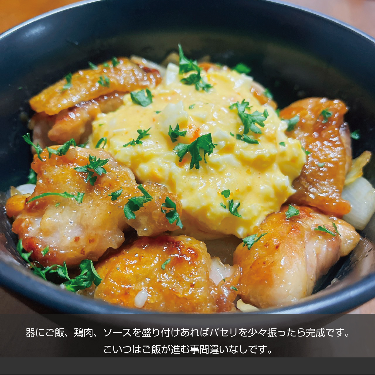 ⑤器にご飯、鶏肉、ソースを盛り付けあればパセリを少々振ったら完成です。