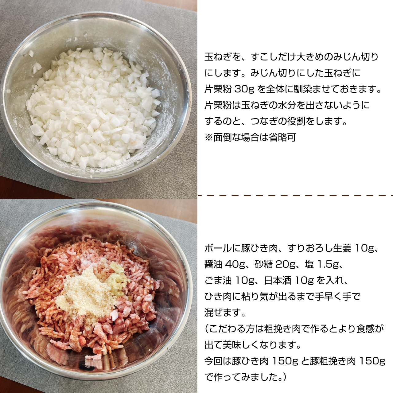 片栗粉は玉ねぎの水分を出さないようにするのと、つなぎの役割をします。※面倒な場合は省略可