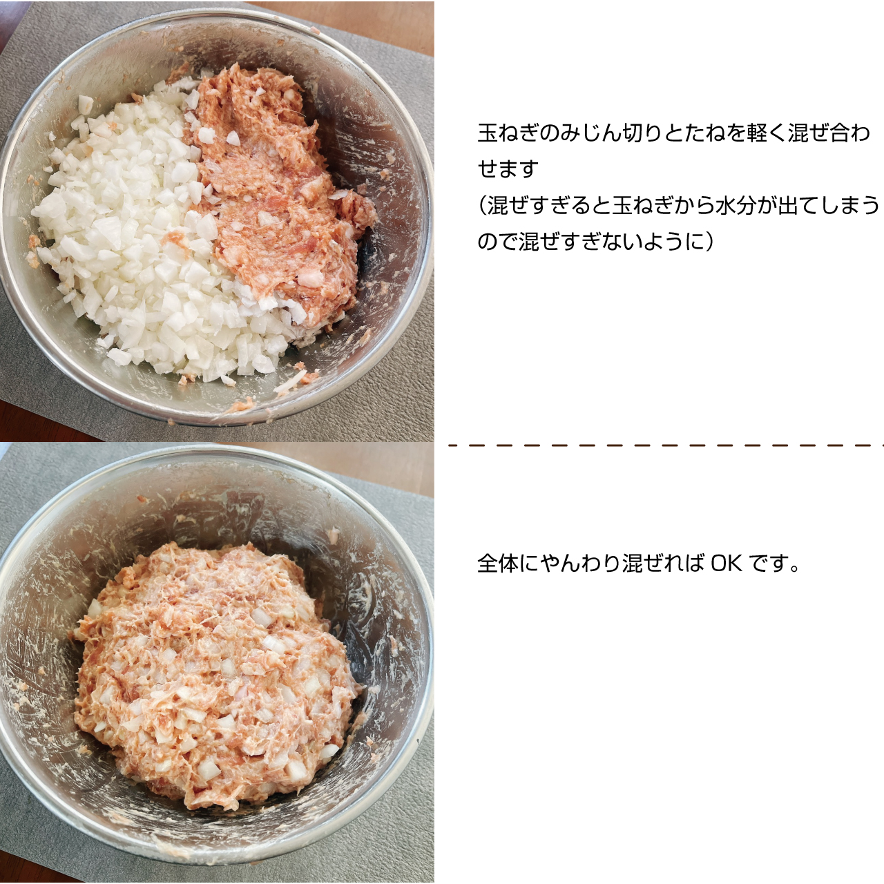 ③ ①の玉ねぎと②のたねを軽く混ぜ合わせます(混ぜすぎると玉ねぎから水分が出てしまうので混ぜすぎないように)