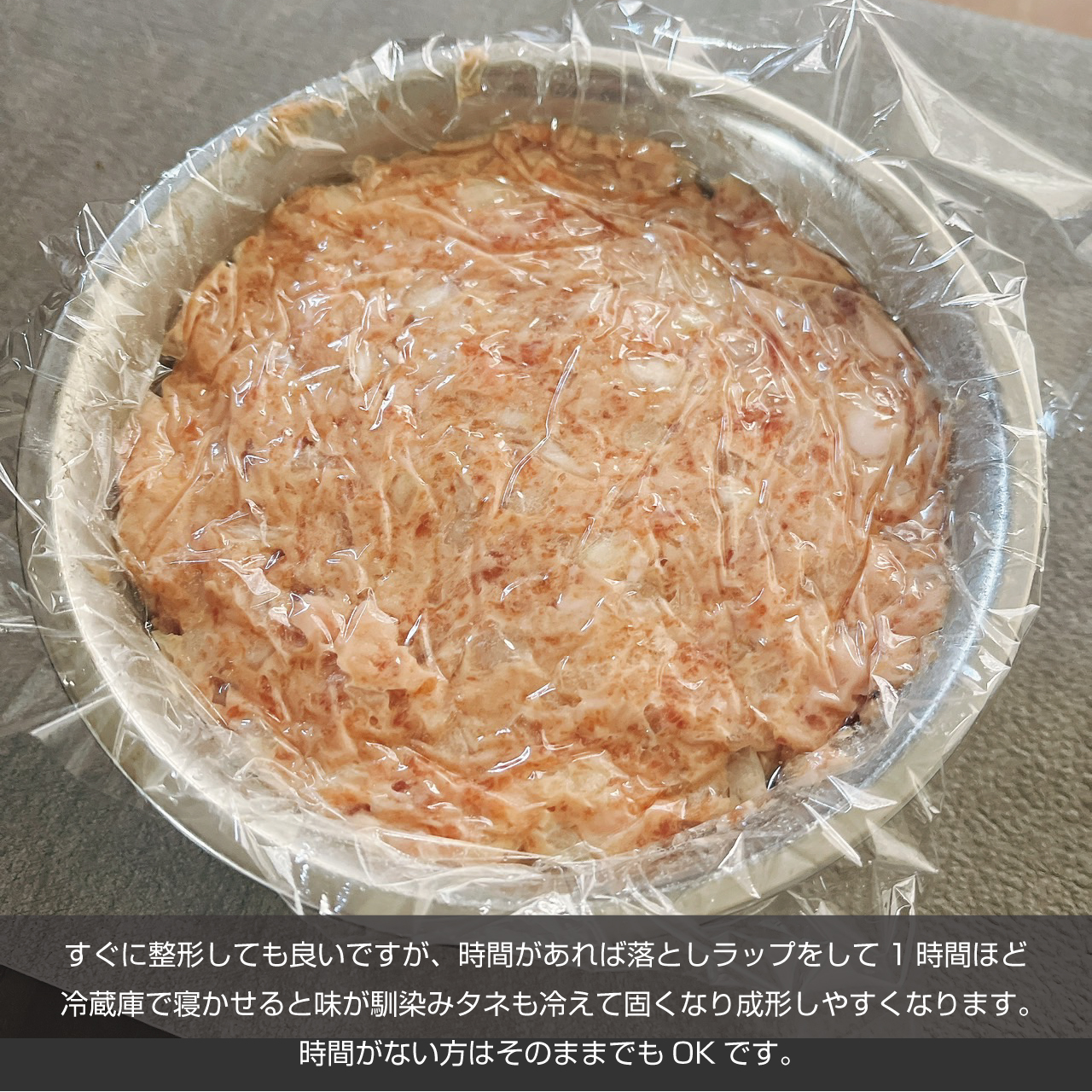 すぐに整形しても良いですが、時間があれば落としラップをして1時間ほど冷蔵庫で寝かせると味が馴染みタネも冷えて固くなり成形しやすくなります。