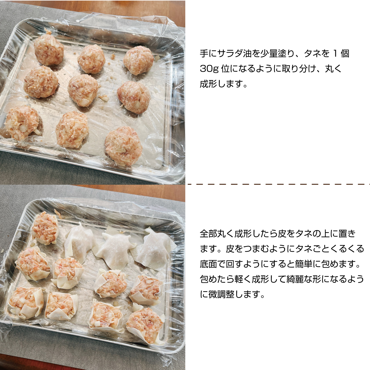 ⑤全部丸く成形したら皮をタネの上に置きます。皮をつまむようにタネ事くるくる底面で回すようにすると簡単に包めます。包めたら軽く成形して綺麗な形になるように微調整します。