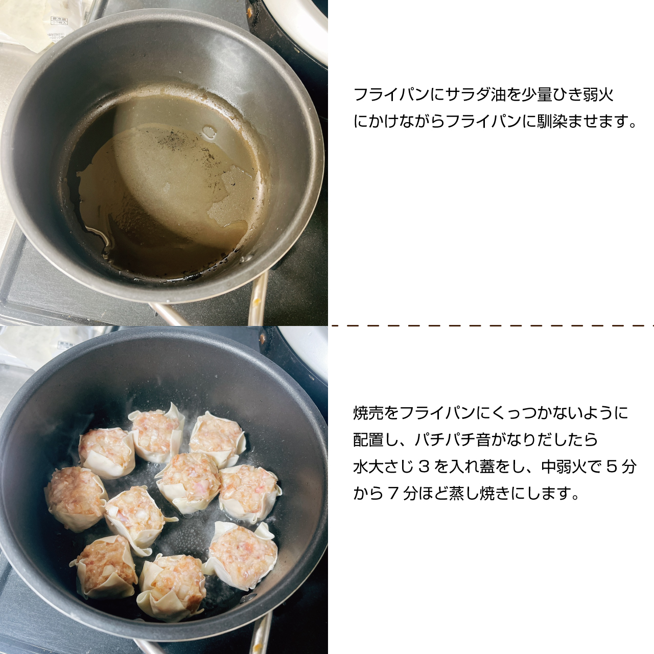 ⑥フライパンにサラダ油を少量ひき弱火にかけながらフライパンに馴染ませます。焼売をフライパンにくっつかないように配置し、パチパチ音がなりだしたら水大さじ3を入れ蓋をし、中弱火で5分から7分ほど蒸し焼きにします。