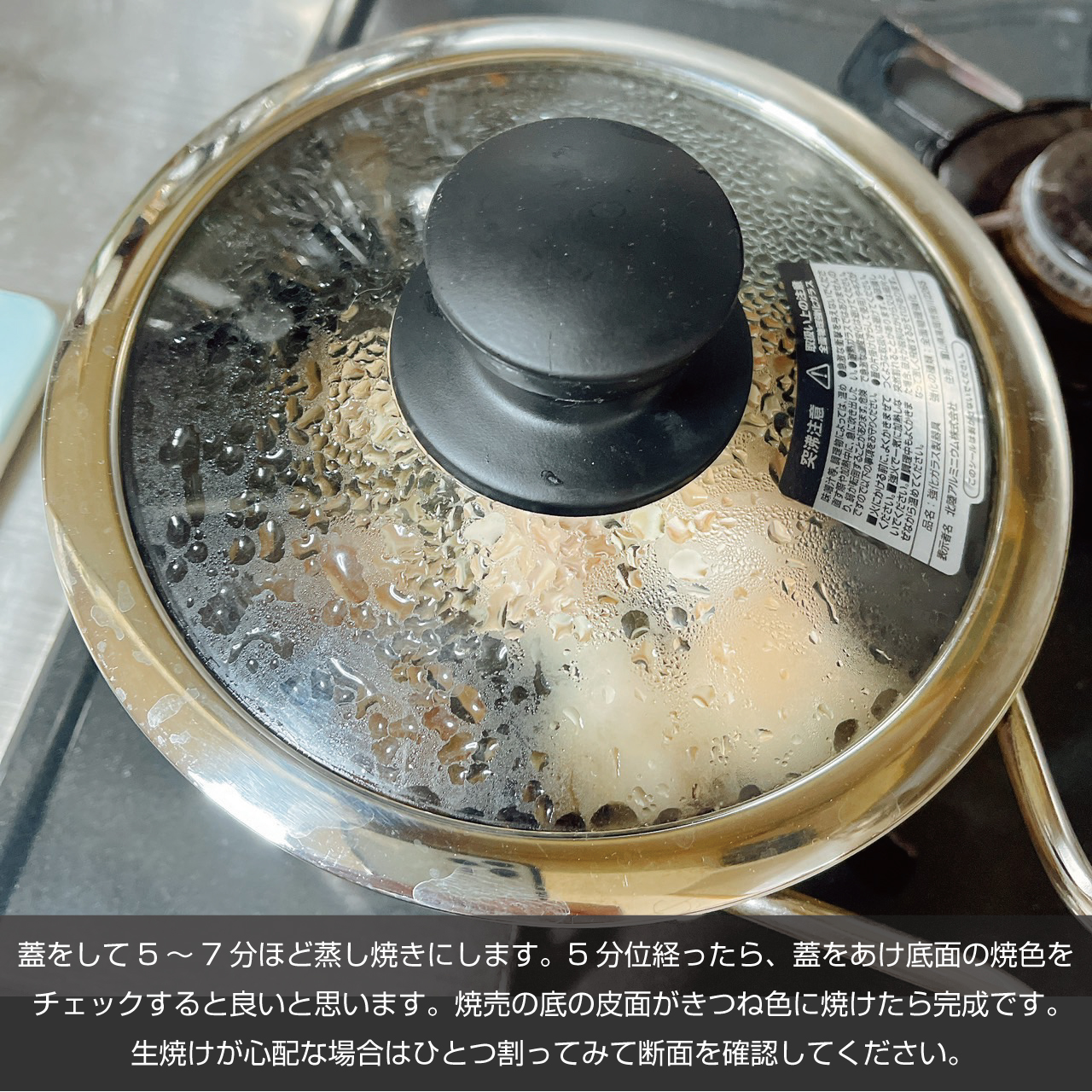 ⑦フライパンの蓋を外し、焼売の底の皮面がきつね色に焼けたら完成です。生焼けが心配な場合はひとつ割ってみて断面を確認してください。