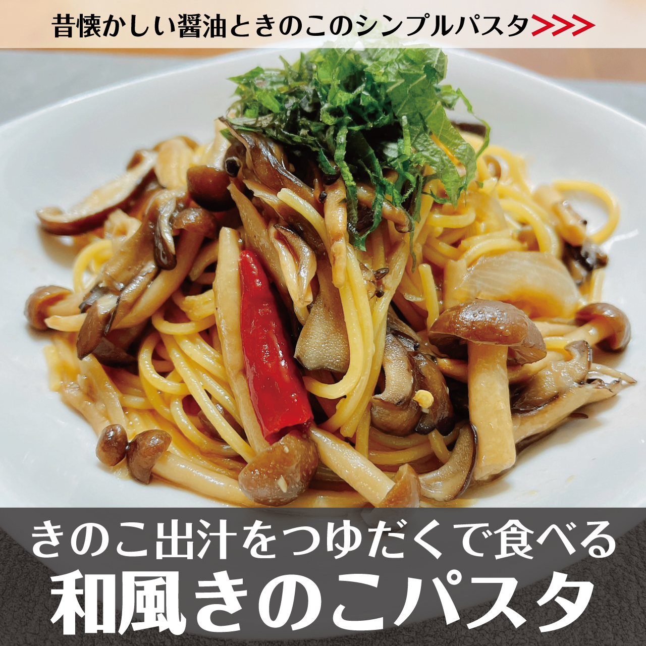 これはですね。醤油、みりん、酒の和風ベースにきのこの出汁をうつした和風パスタです。にんにくも使いますが、シンプルな材料でできてなんだかホッとするような優しいパスタです。