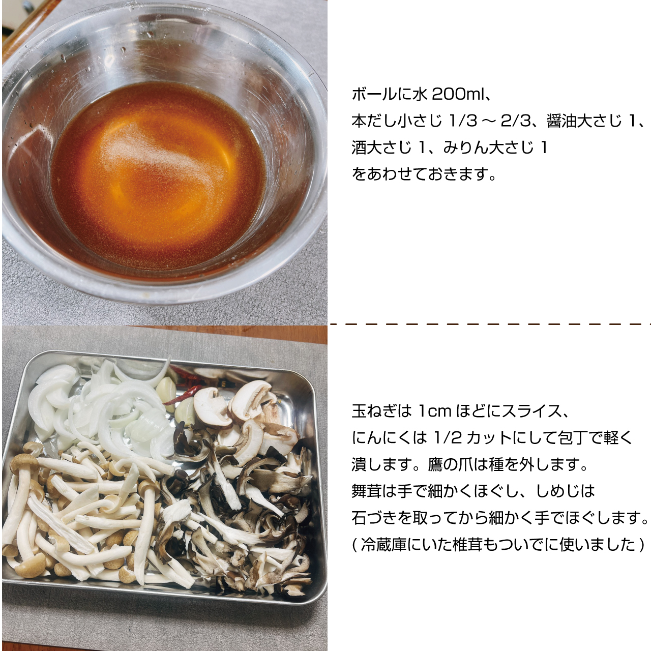 舞茸は手で細かくほぐし、しめじは石づきを取ってから細かく手でほぐします。