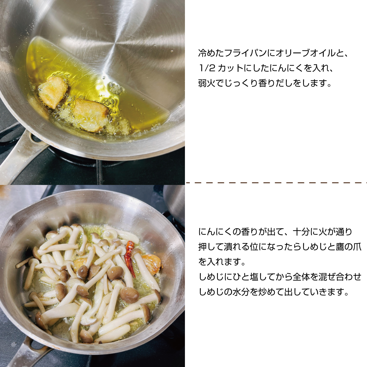 にんにくの香りが出て、十分に火が通り押して潰れる位になったらしめじと鷹の爪を入れます。しめじにひと塩してから、全体を混ぜ合わせしめじの水分を炒めて出していきます。