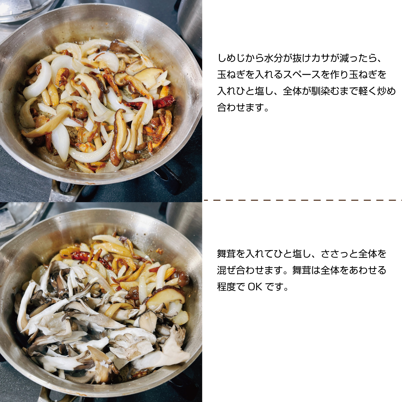 ④しめじから水分が抜けカサが減ったら、玉ねぎを入れるスペースを作り玉ねぎを入れひと塩し、全体が馴染むまで軽く炒め合わせます。