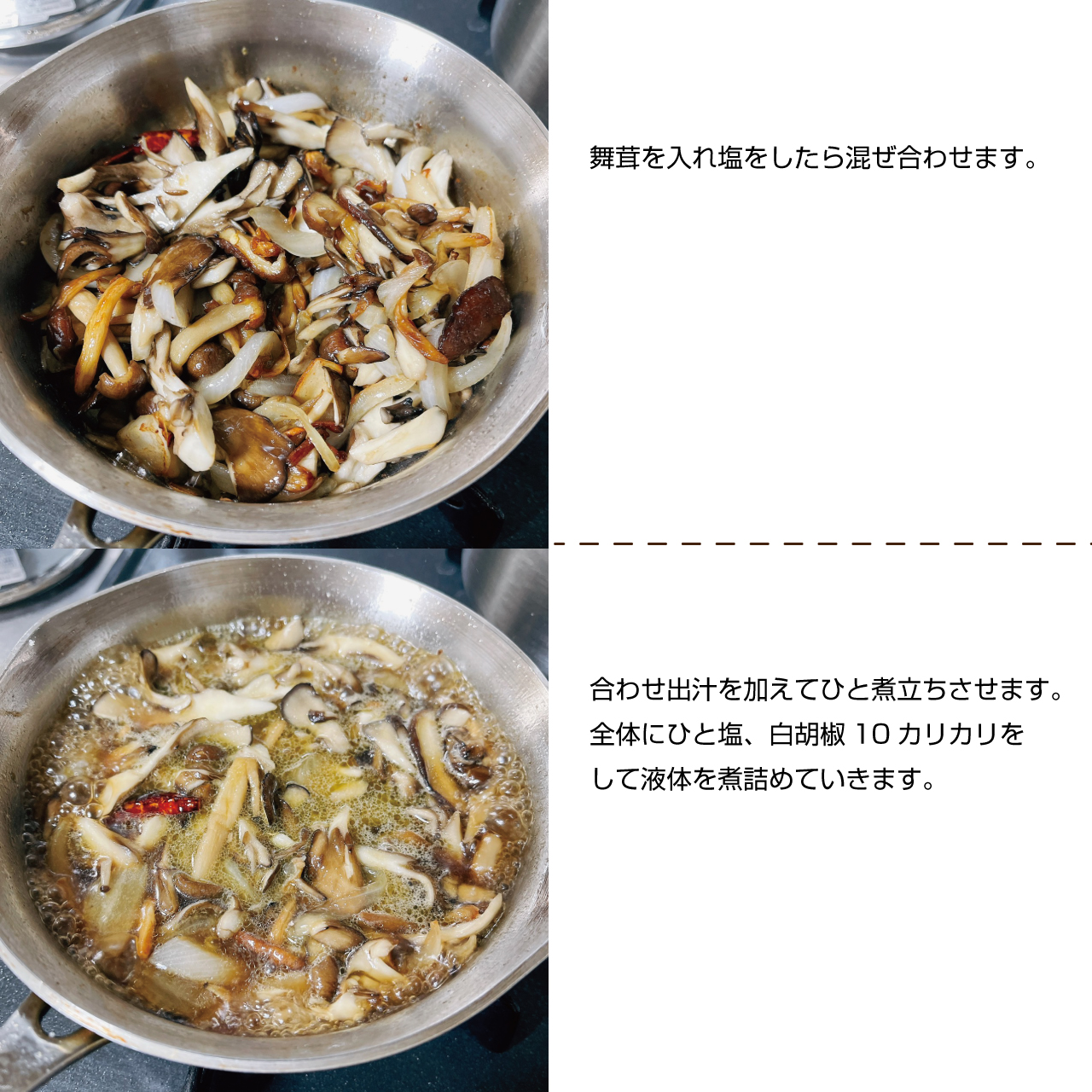 ⑤舞茸を入れてひと塩し、全体に合わせたら①の合わせ出汁を加えてひと煮立ちさせます。全体にひと塩、白胡椒10カリカリをして液体を煮詰めていきます。