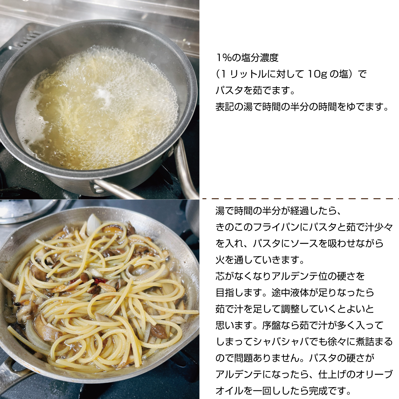 パスタを標準茹で時間の半分を普通に塩茹でし、半分はにんにく、きのこをオリーブオイルで炒め、和風出汁を入れたソースの中で液体を吸わせながらアルデンテの硬さにして仕上げるというレシピです。