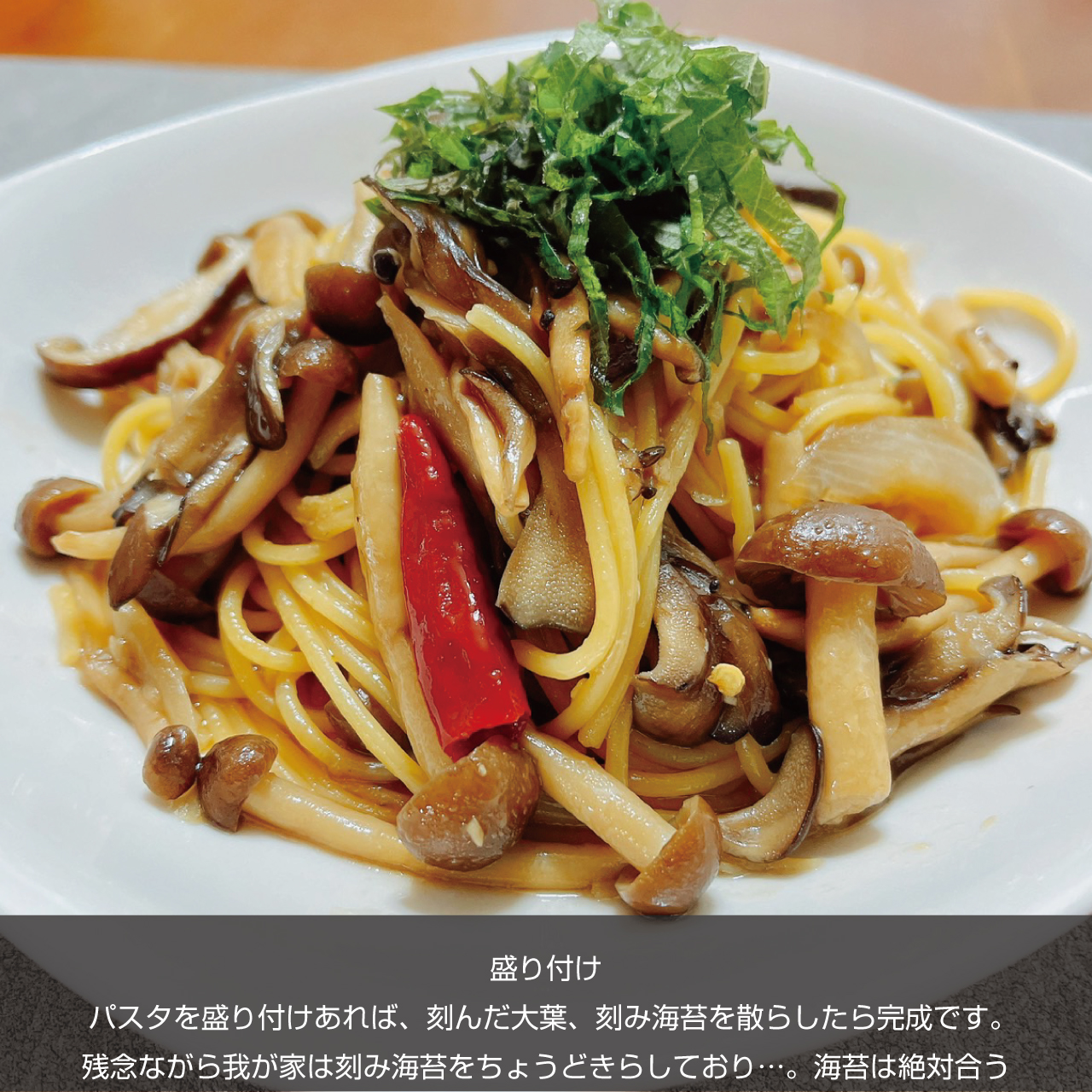 ⑦盛り付け パスタを盛り付けあれば、刻んだ大葉、刻み海苔を散らしたら完成です。