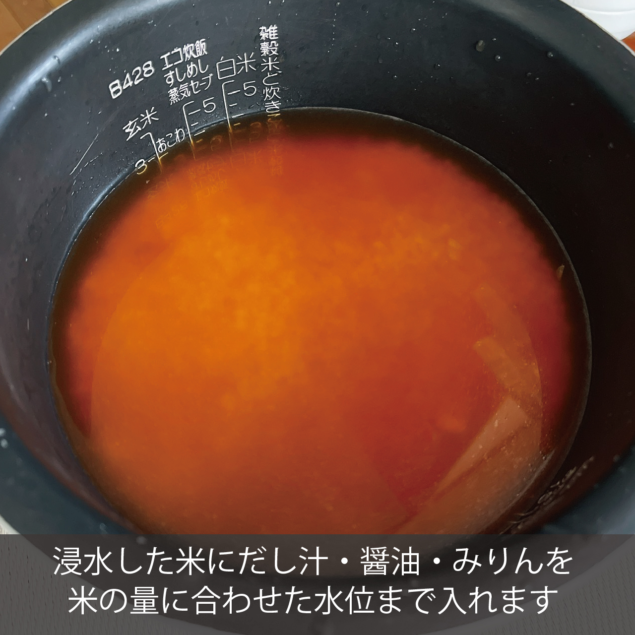 ❹米が浸水したら、一度ざるなどにあげて水気をしっかり切ります。水気が取れたら炊飯器の内釜に入れます。そこに醤油とみりんを先にいれ、だし汁を白米の4合の目盛りまで注ぎます。
