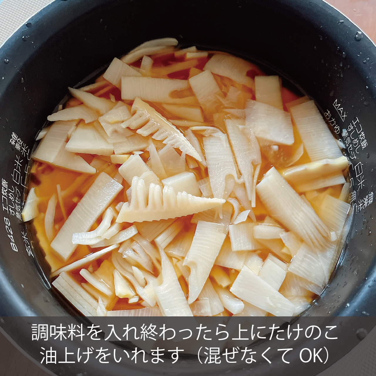 だし汁は600mlと書きましたが、内釜の目盛りを優先させてください。入れたらよく混ぜあわせ油揚げとたけのこを米の上に入れます。(油揚げとたけのこはまぜなくてOKです)
