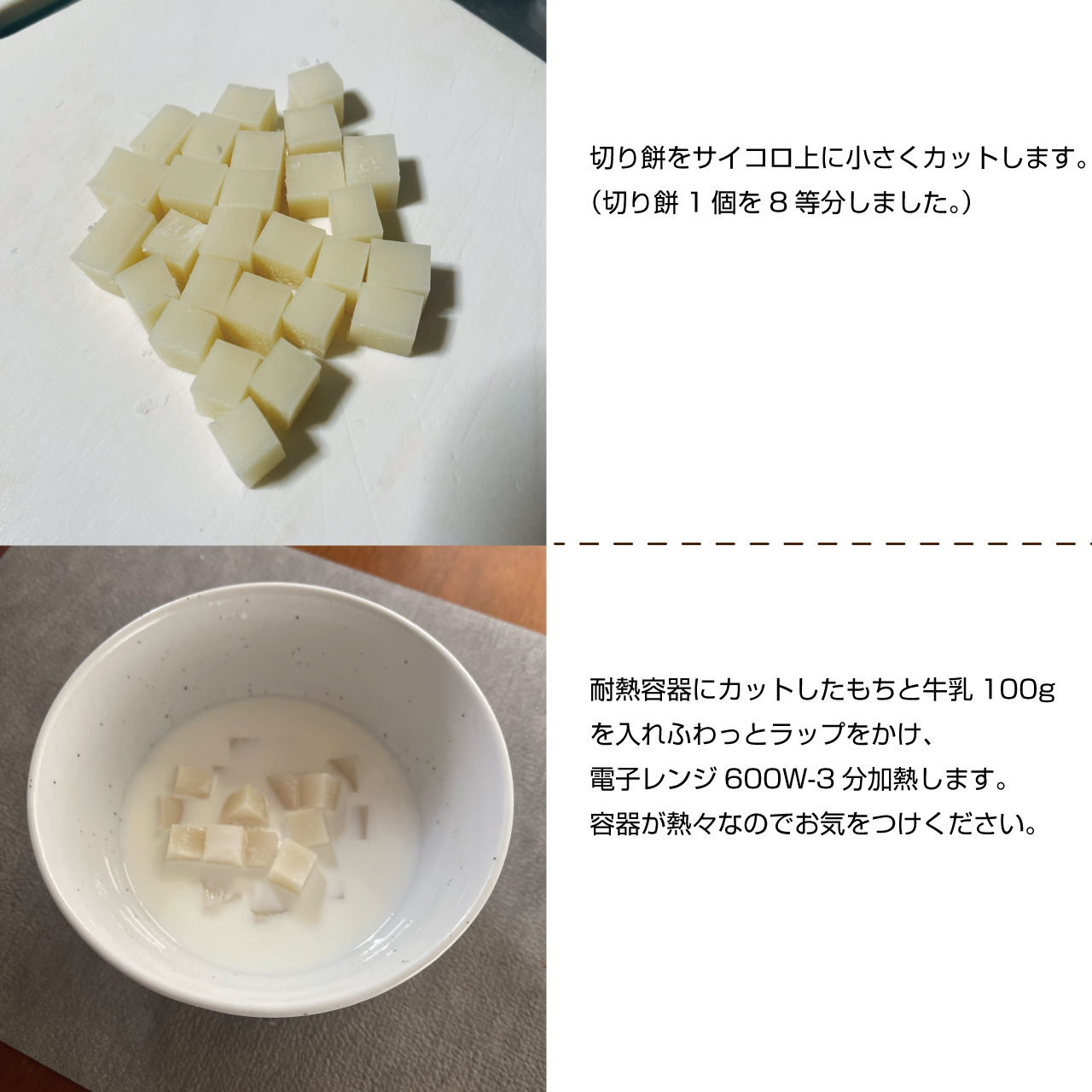 耐熱容器にカットしたもちと牛乳100gを入れふわっとラップをかけ、電子レンジ600W-3分加熱します。容器が熱々なのでお気をつけください。